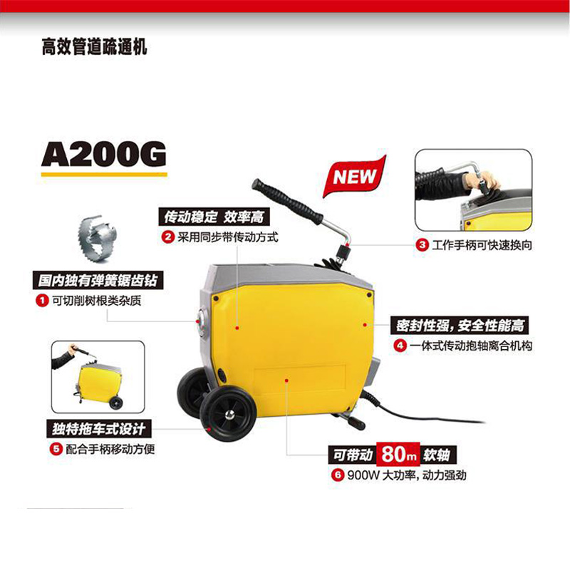 A200G疏通機配有移動的輪子,以及可以變換方向的手柄,這樣就可以輕松地移動到工作的地方,簡便輕巧。本款機器疏通清理能力強勁,可以使用于極端的工作條件中,可以切除打通管道中復雜的樹根、紡織品、固體沉淀物等雜物。